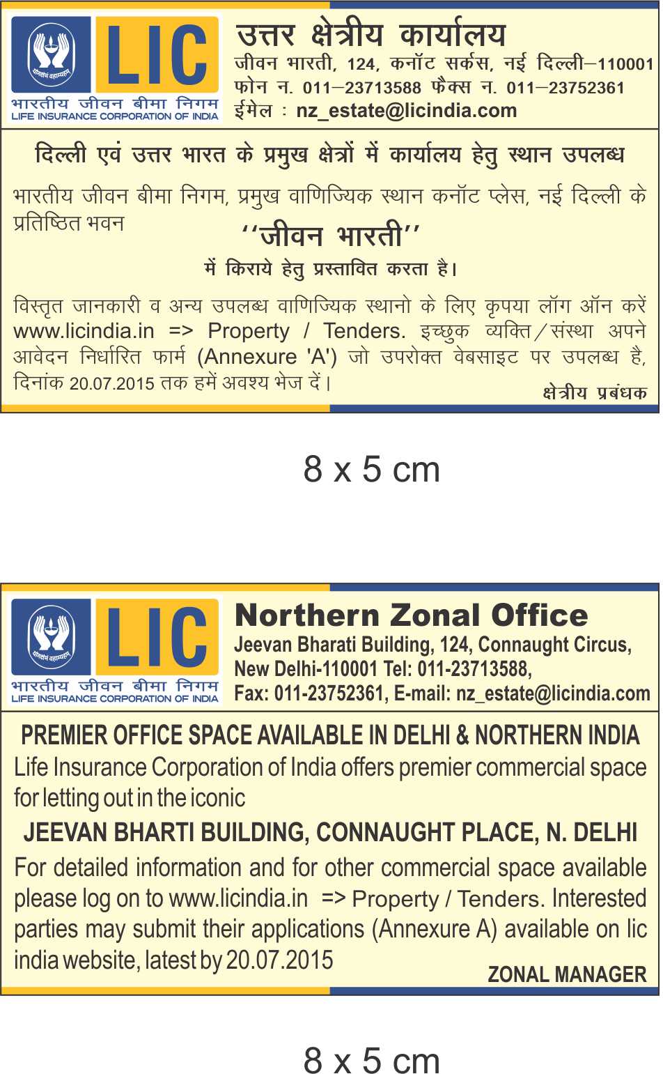 Advertisement for letting out vacant space in Delhi & North India LIC Northern Zonal Office, New Delhi