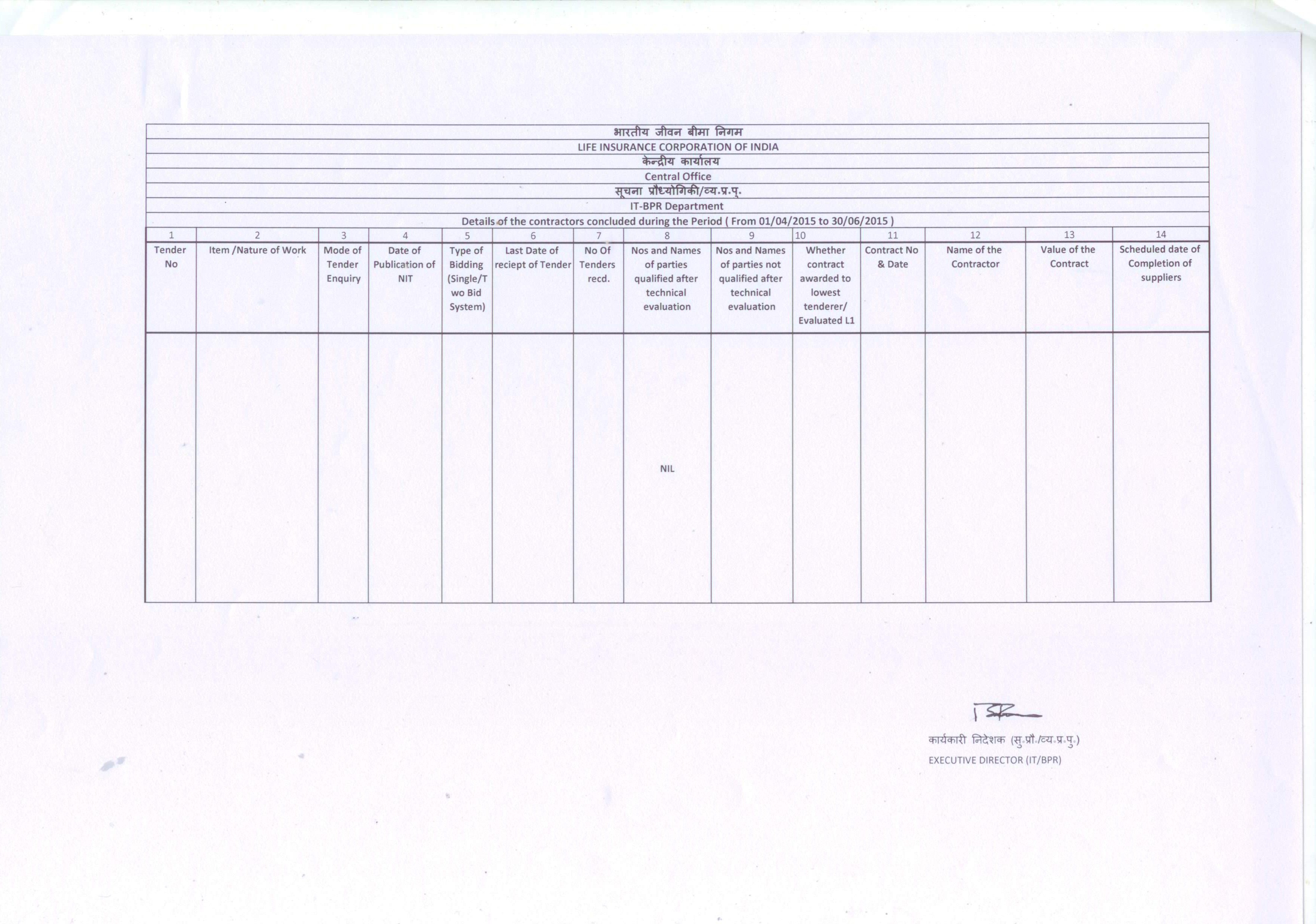 DETAILS OF THE CONCTRACTS CONCLUDED DURING THE PERIOD 01.04.2015 TO 30.06.2015 - LIC Central Office, IT-BPR dept.
