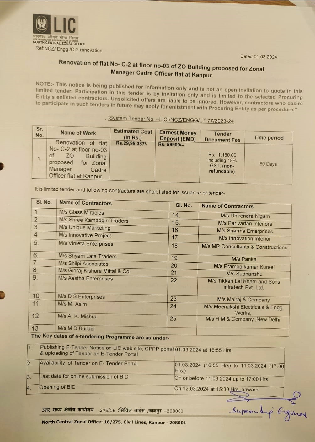 E- tender for Renovation of flat no C-2 at floor no 03 of ZO building proposed for Zonal Manager Cadre Officer flat at Kanpur. ( Bid No. LIC/NCAZ/Engg./LT- 77/2023-24)