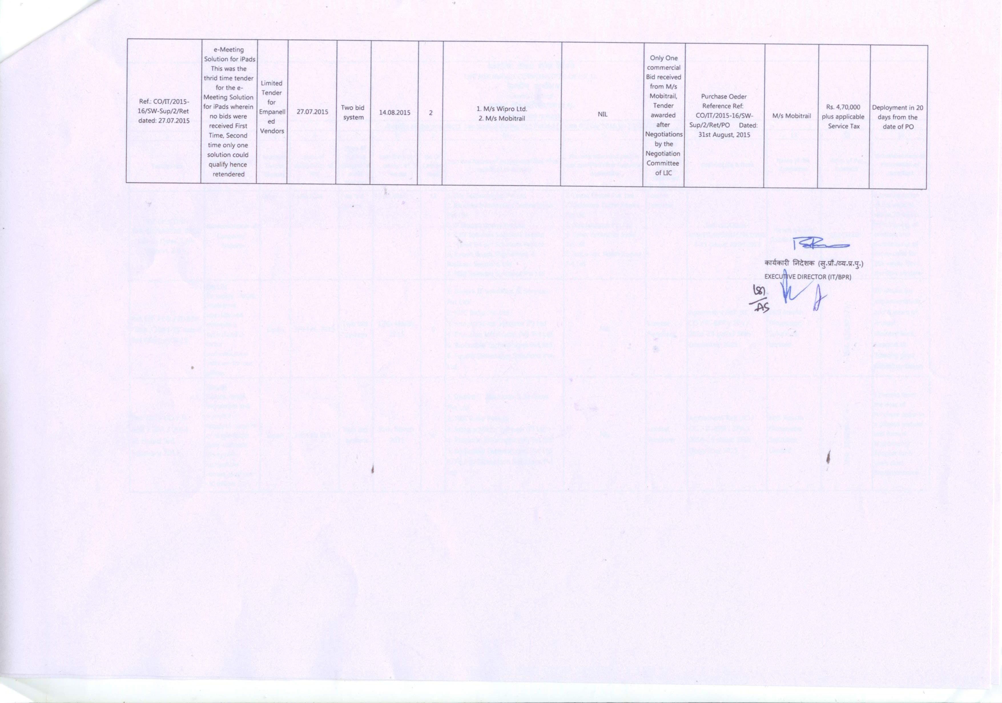 STATEMENT OF DETAILS OF CONTRACTS CONCLUDED DURING THE PERIOD FROM 01.04.2015 TO 29.02.2016 - LIC Central Office - IT BPR Dep't.