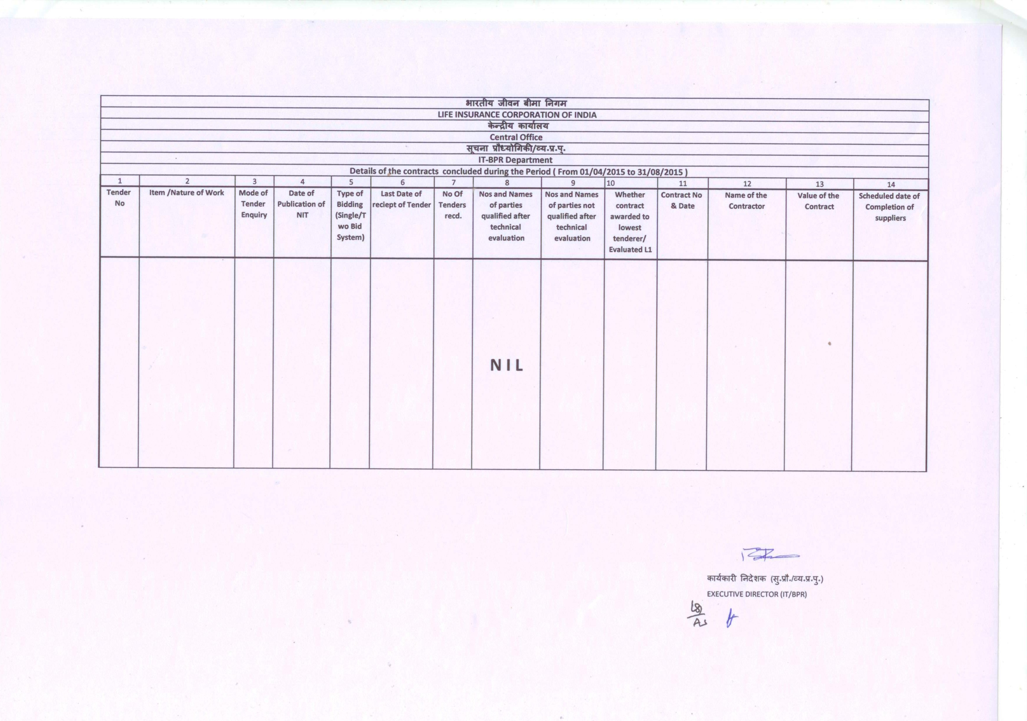 STATEMENT OF DETAILS OF CONTRACTS CONCLUDED DURING THE PERIOD FROM 01.04.2015 TO 31.08.2015 - LIC Central Office, IT-BPR Dept.
