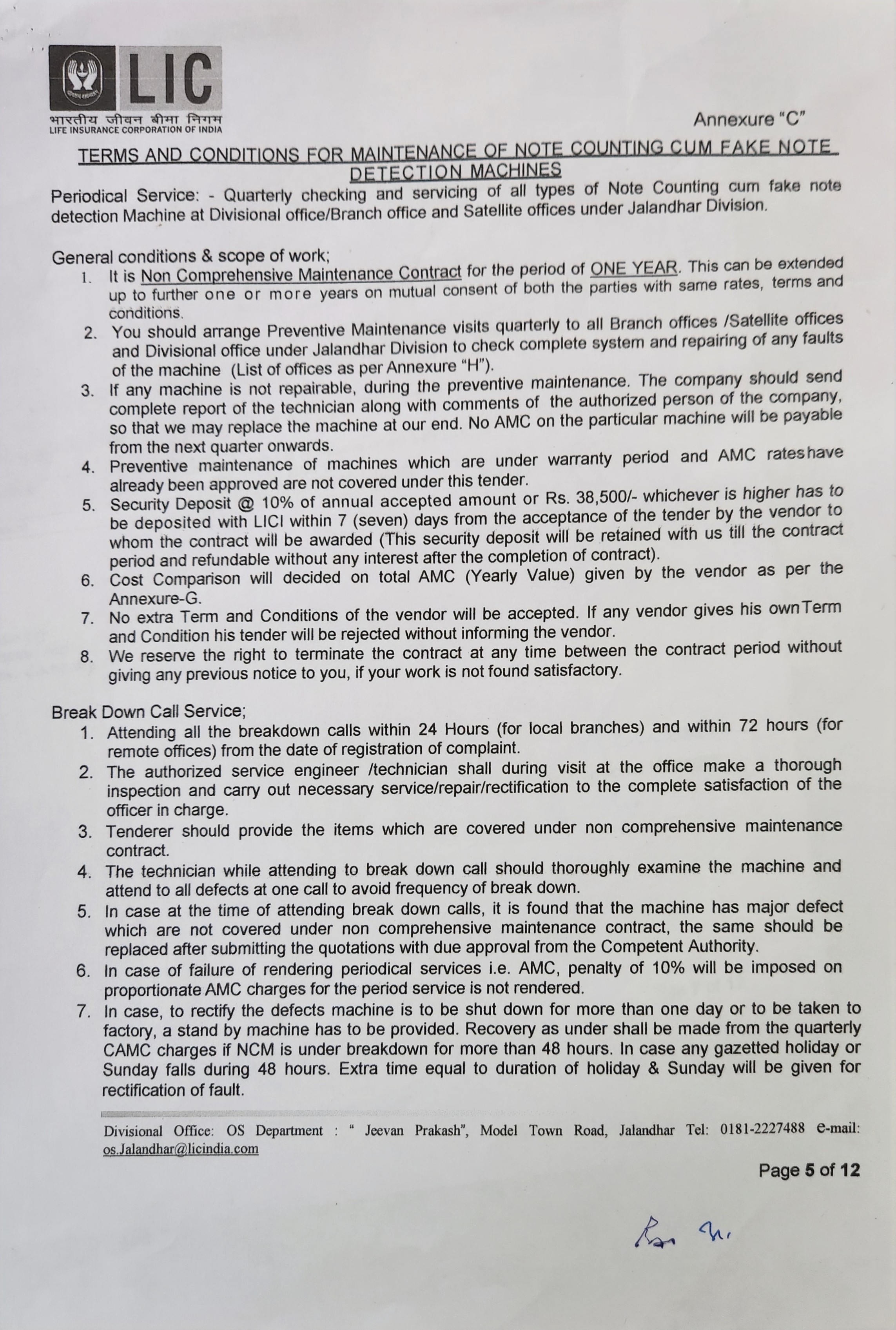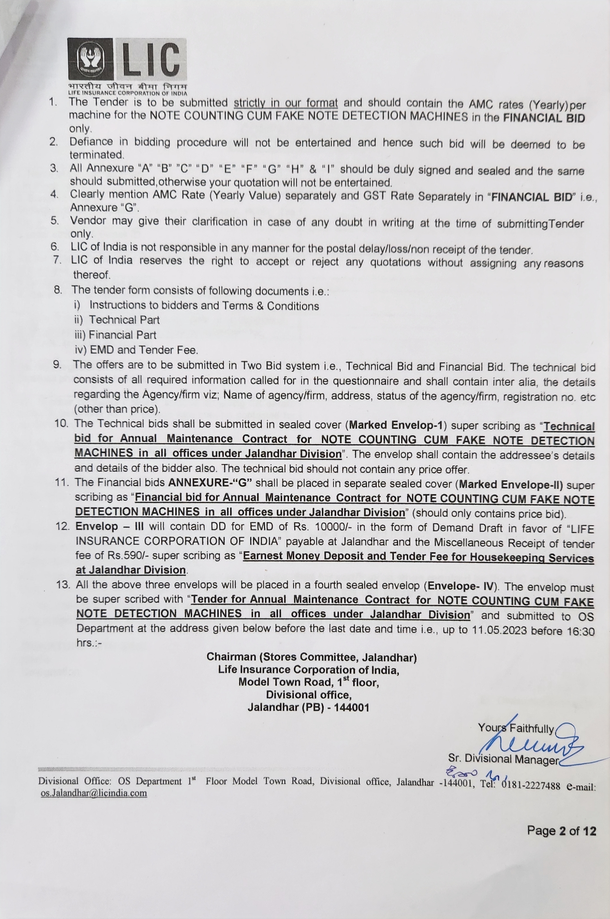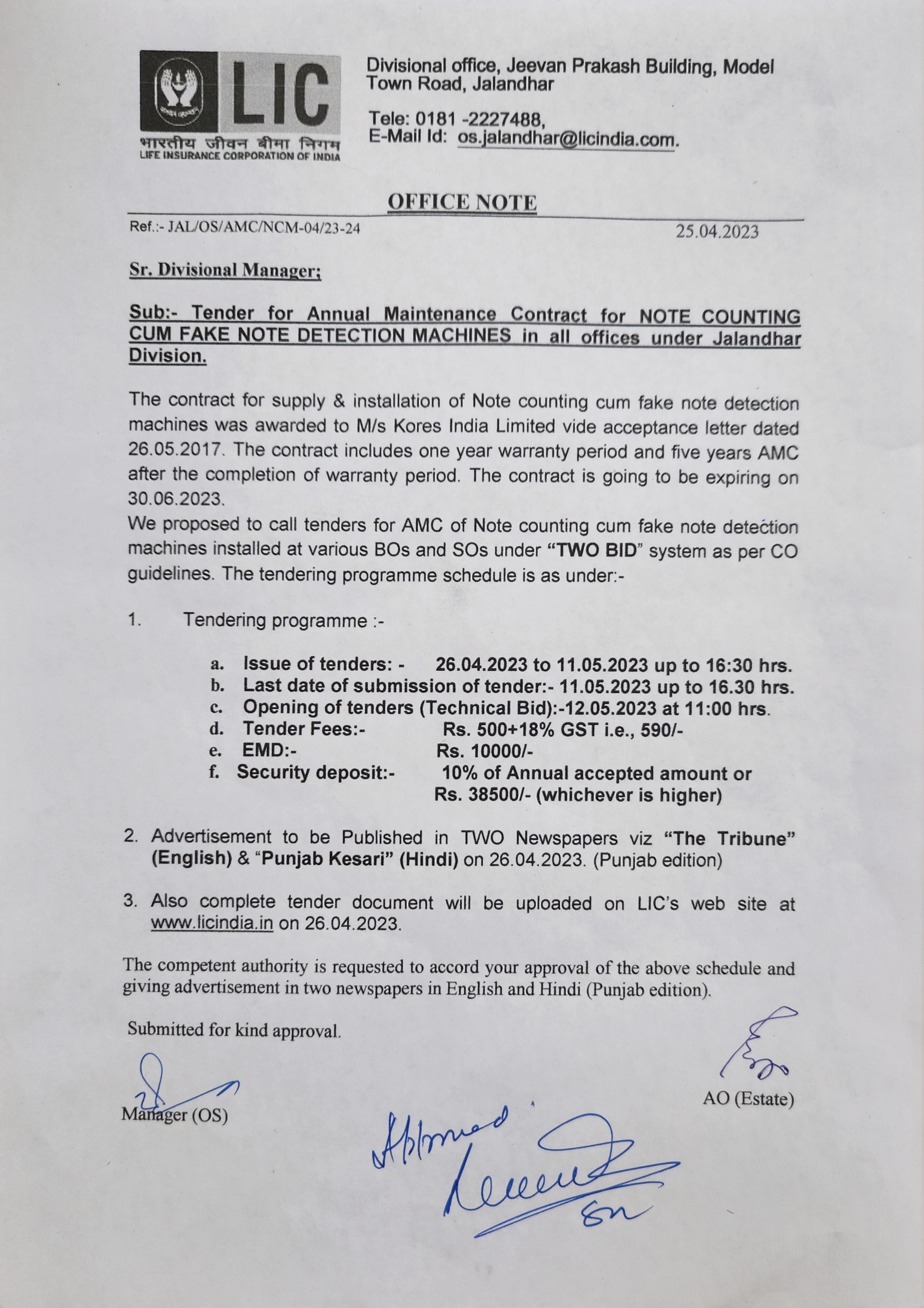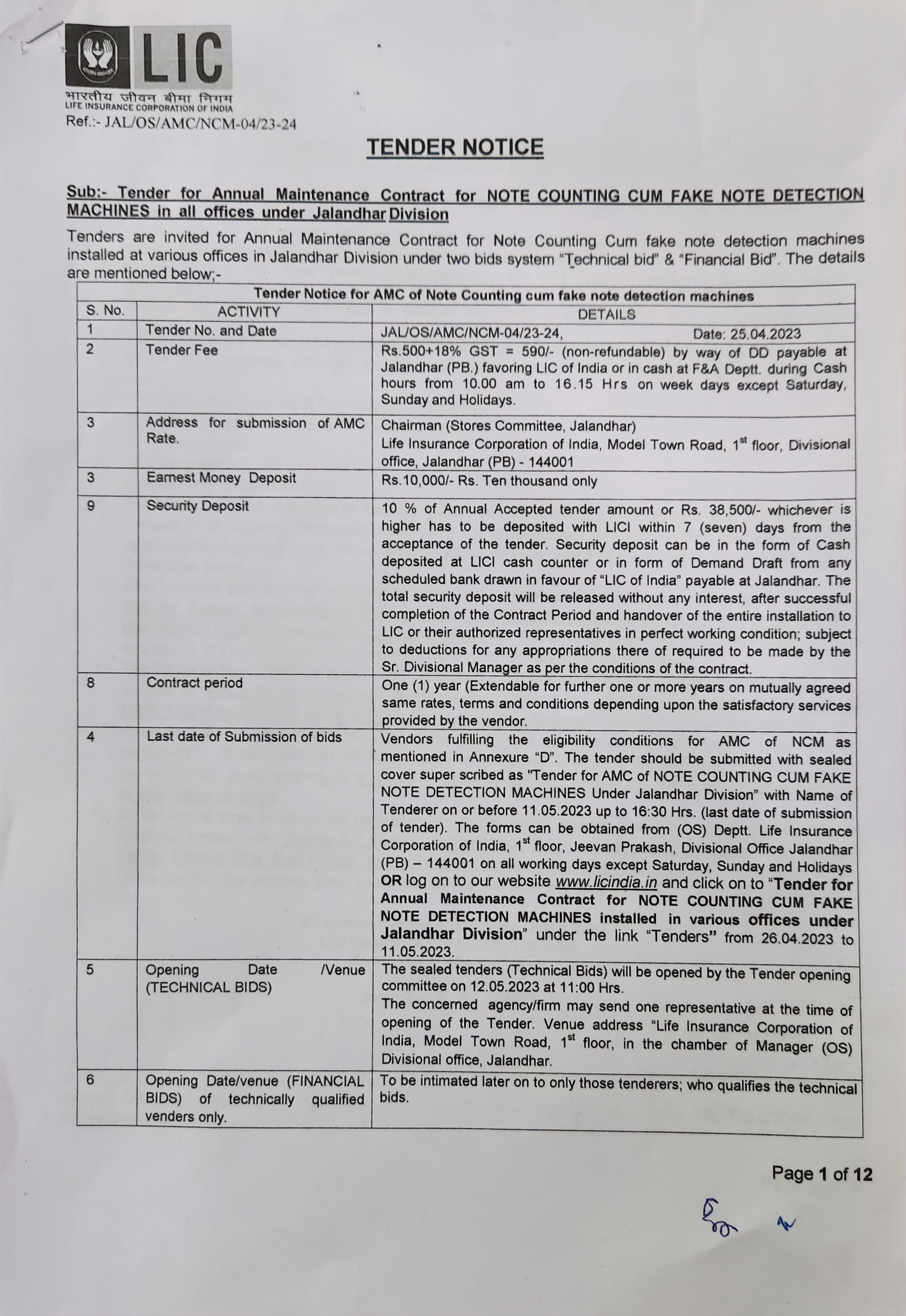 Tender for Note Counting cum Fake Note detection machines under all the branches of DO Jalandhar - DO Jalandhar