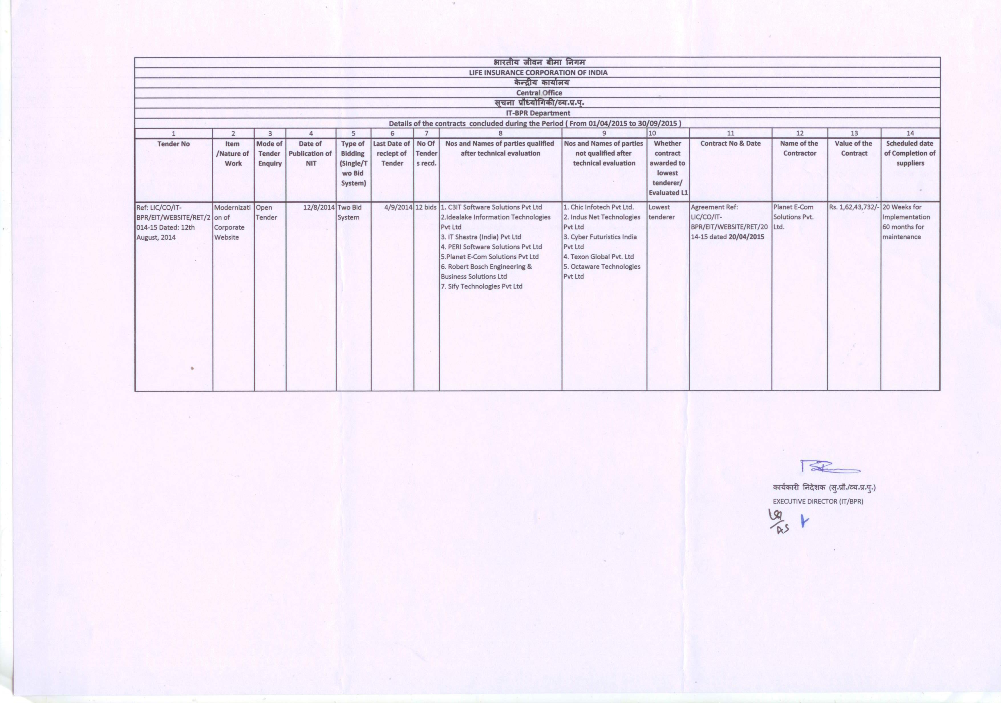 STATEMENT OF DETAILS OF CONTRACTS CONCLUDED DURING THE PERIOD FROM 01.04.2015 TO 30.09.2015 - LIC Central Office, IT-BPR Dept.