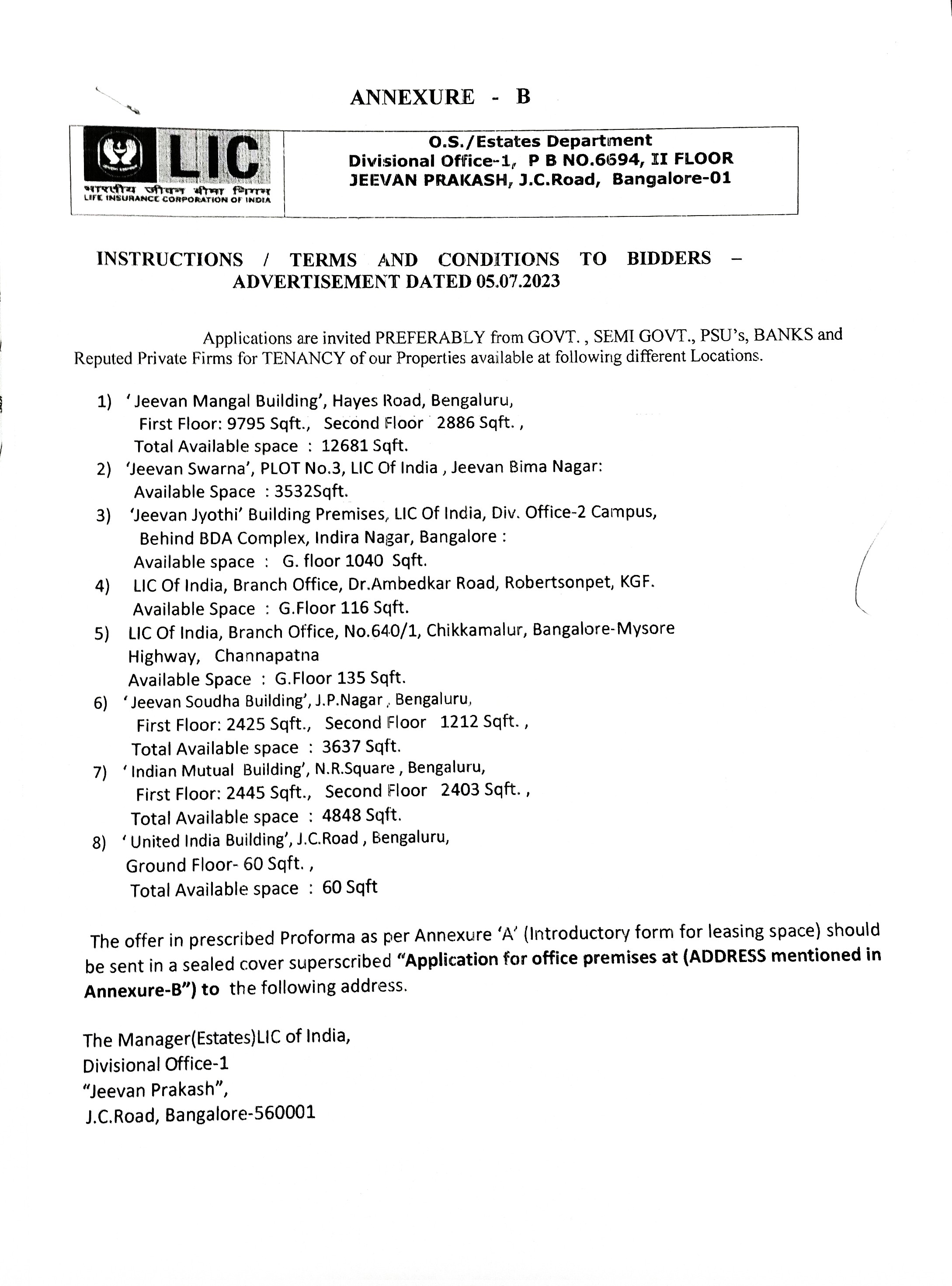 Advertisement for Commercial Office vacant space for letting out on lease basis at various locations in Bangalore