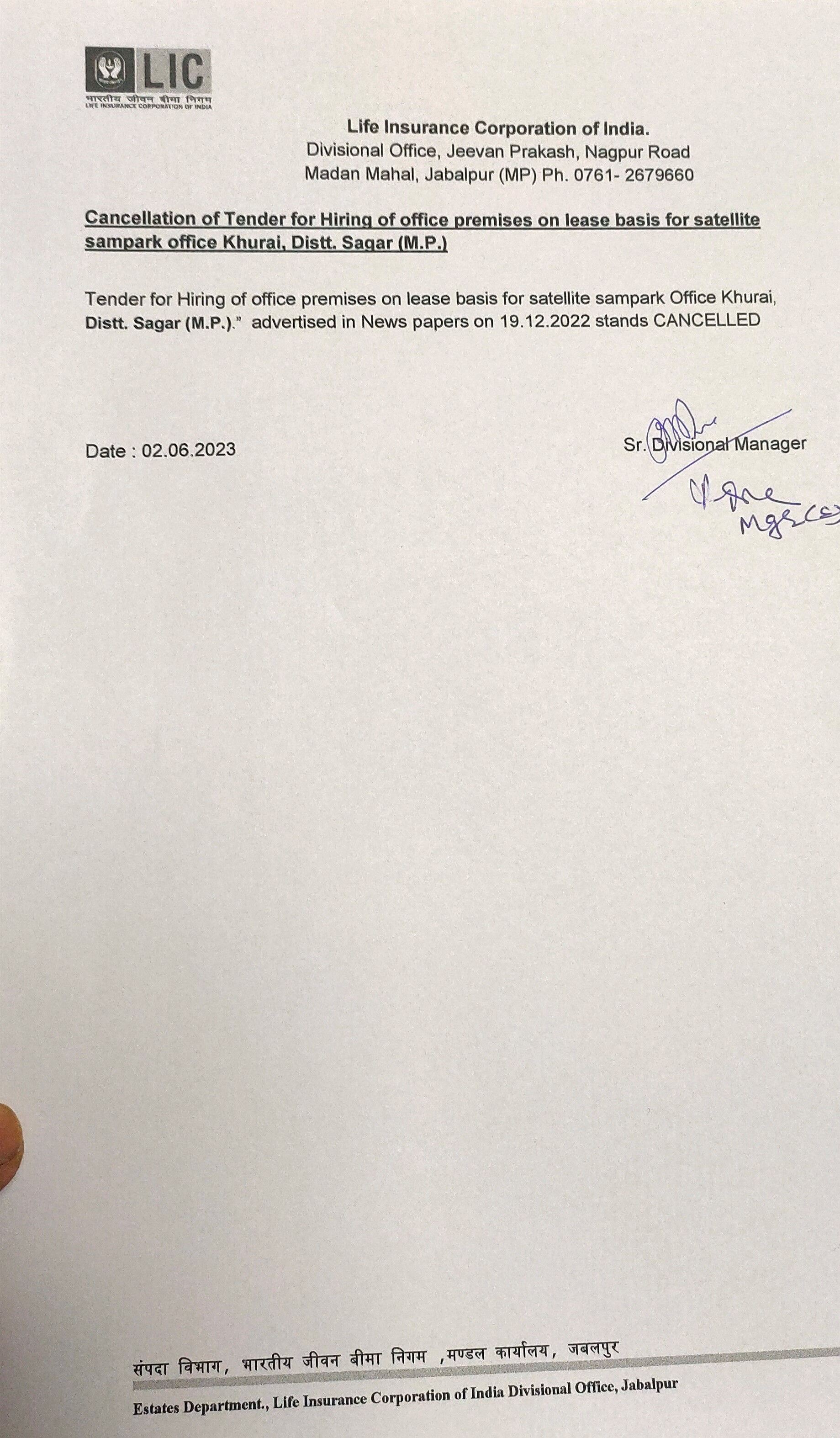 Cancellations of Tender for Hiring of office premises on lease basis for satellite sampark office Khurai, Distt Sagar (MP)