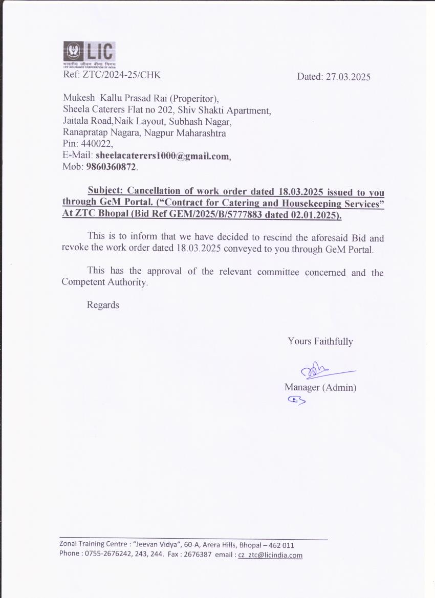 Contract For Catering And Housekeeping Services At ZTC Bhopal