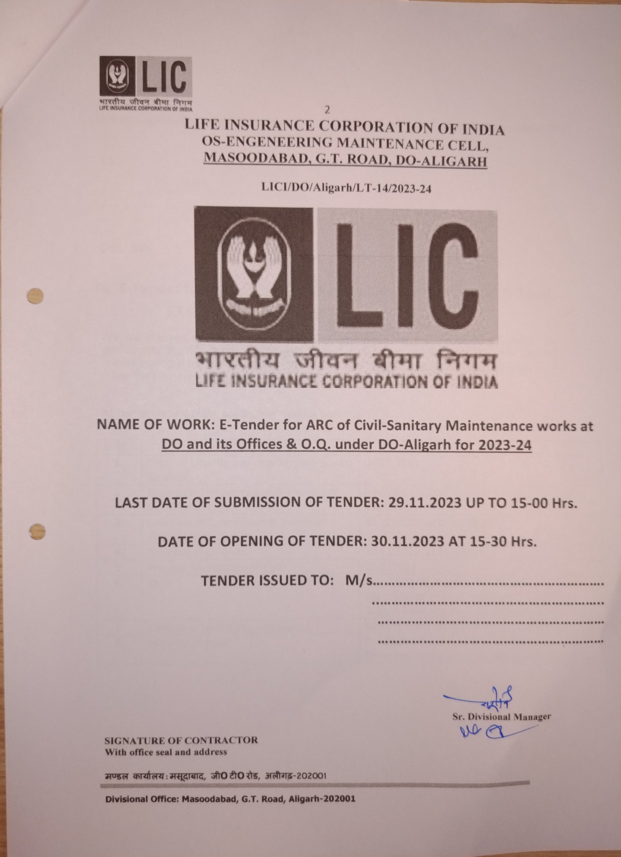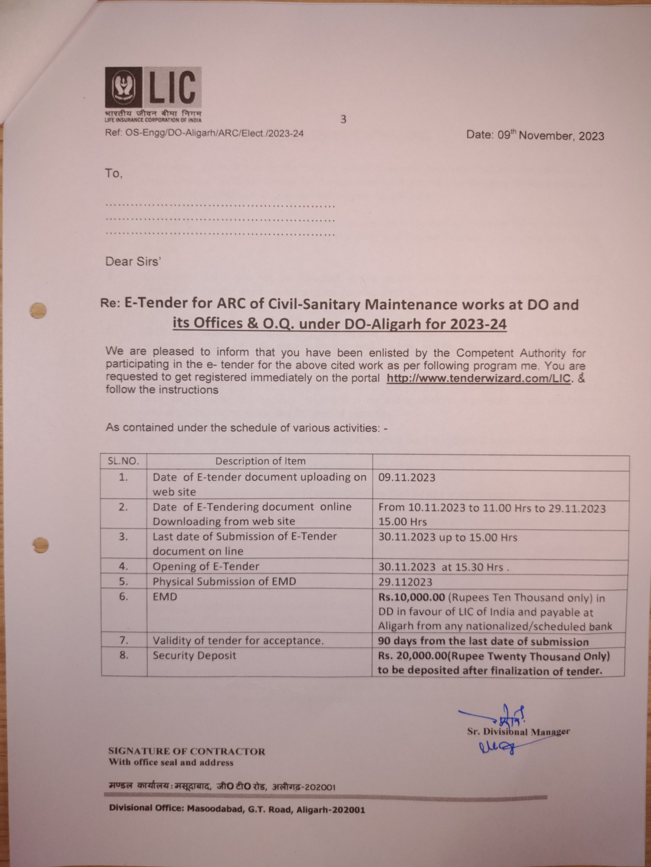 Re-"Notice for ARC for Civil works of Divisional Office Aligarh"