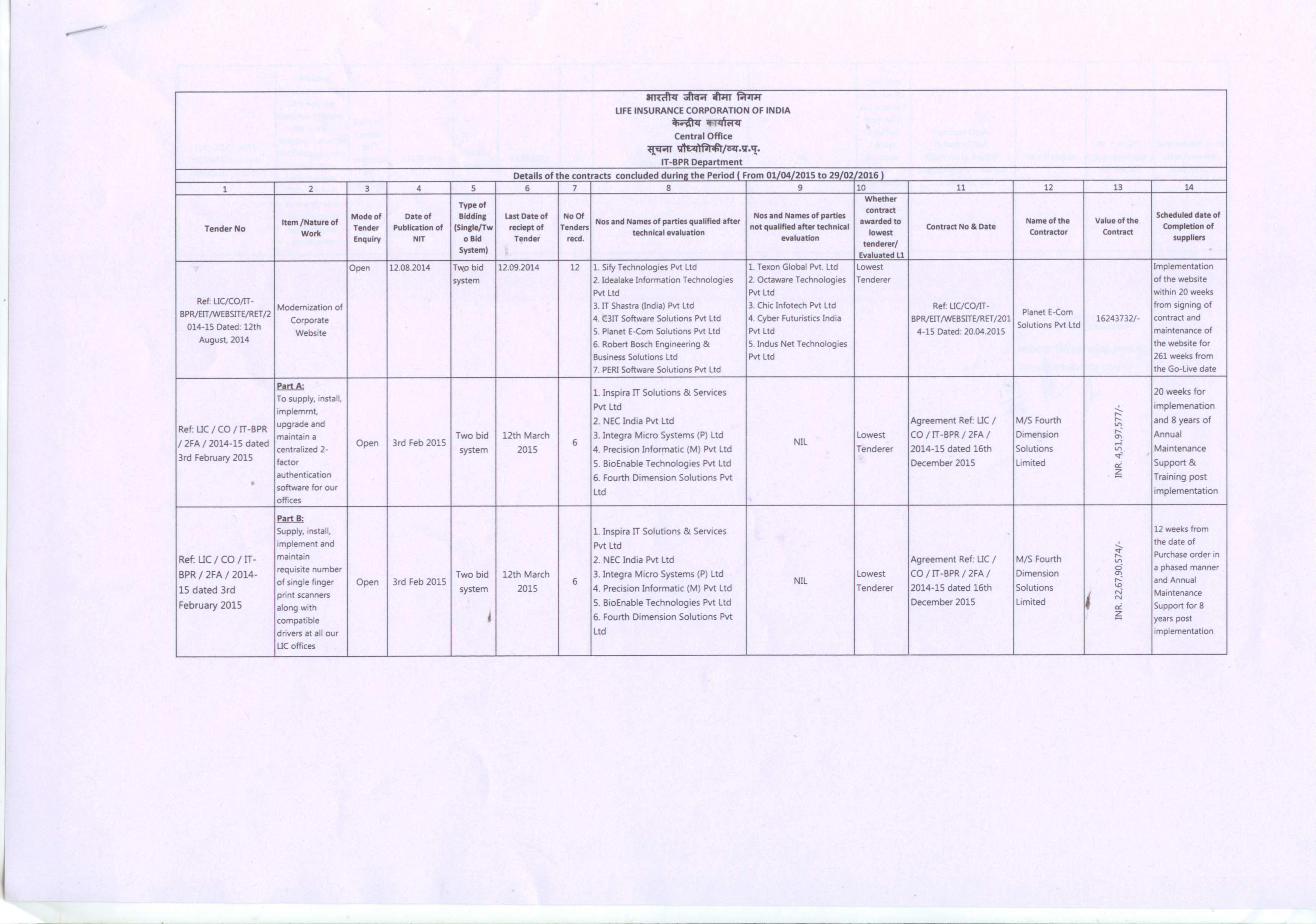STATEMENT OF DETAILS OF CONTRACTS CONCLUDED DURING THE PERIOD FROM 01.04.2015 TO 29.02.2016 - LIC Central Office - IT BPR Dep't.