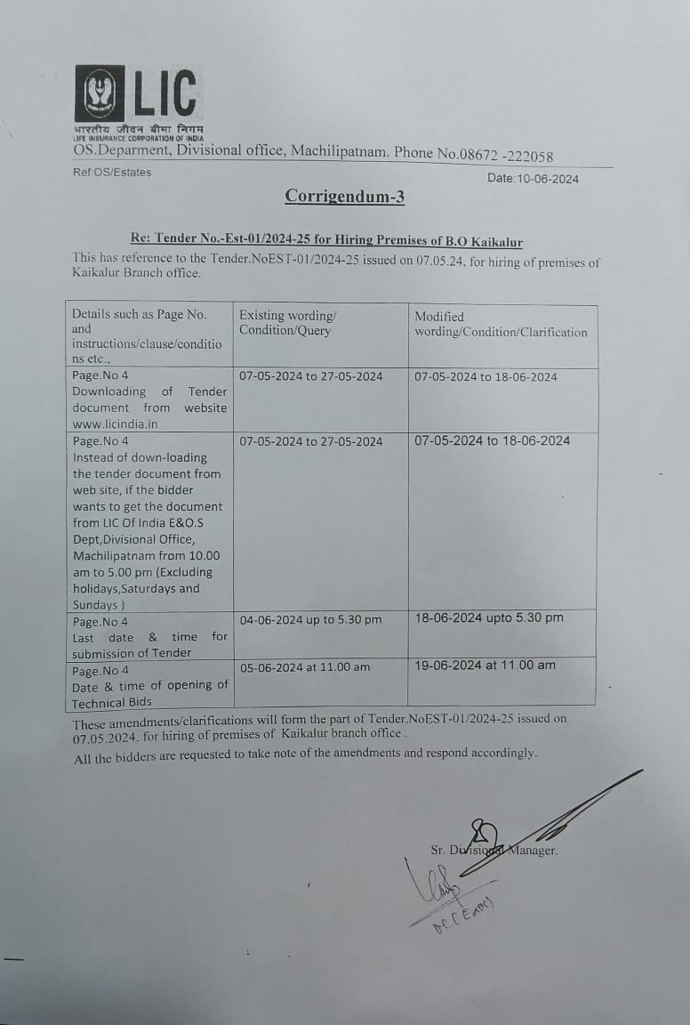 Tender for hiring New premises of Kaikalur, Gurazala and Jaggayapet branch offices - os.machilipatnam