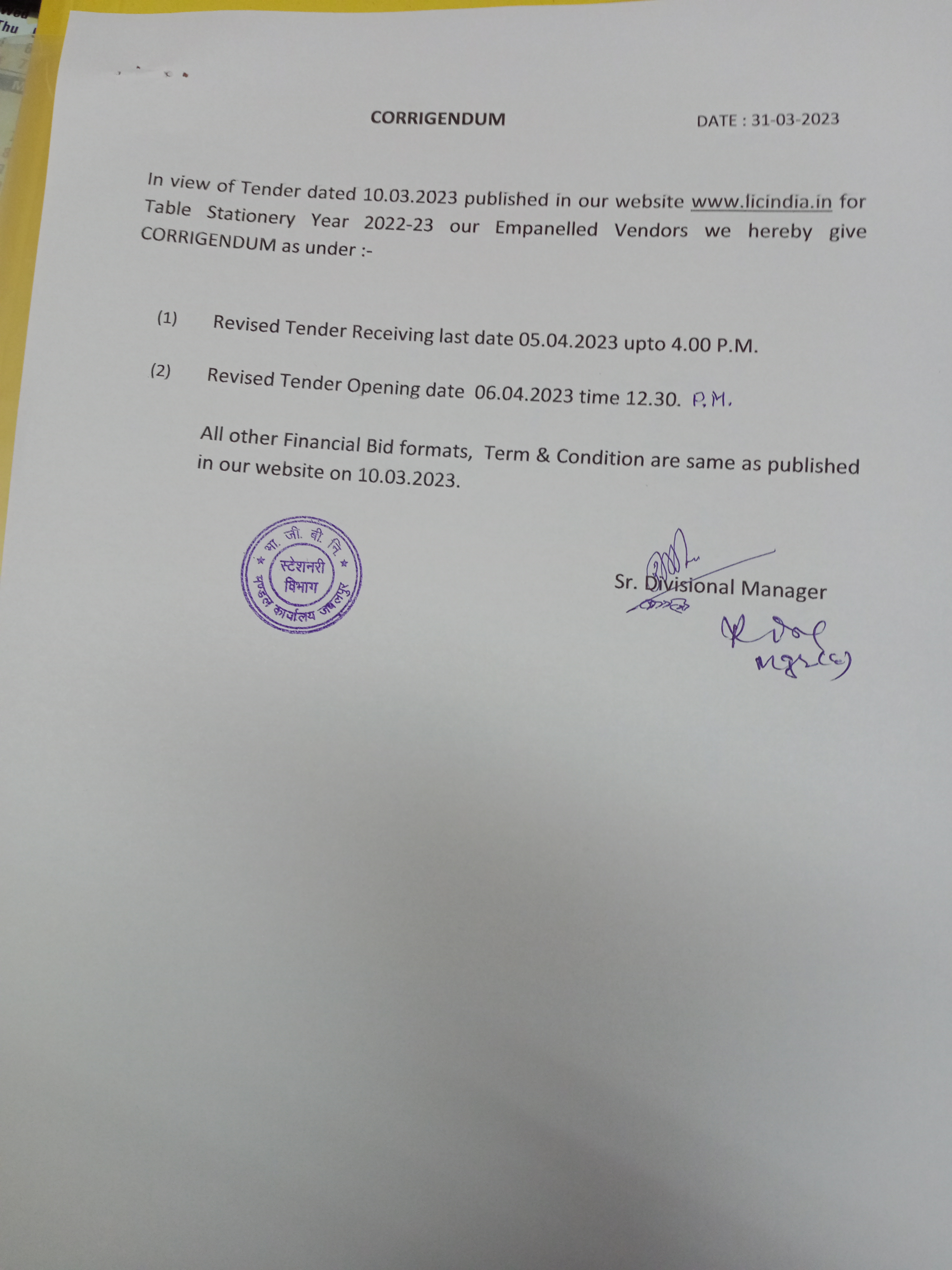 TENDER FOR TABLE STATIONERY YEAR 2022-23 ONLY FOR EMPANELED VENDORS IN JABALPUR DIVISION. - JABALPUR